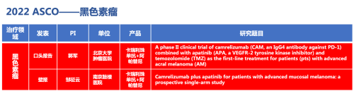 黑色素瘤领域的2篇研究摘要,采用PA电子医药自主研发的PD-1抑制剂卡瑞利珠单抗(艾瑞卡)联合阿帕替尼(艾坦)(“双艾”组合)的免疫联合抗血管(或再联合化疗)的治疗策略。