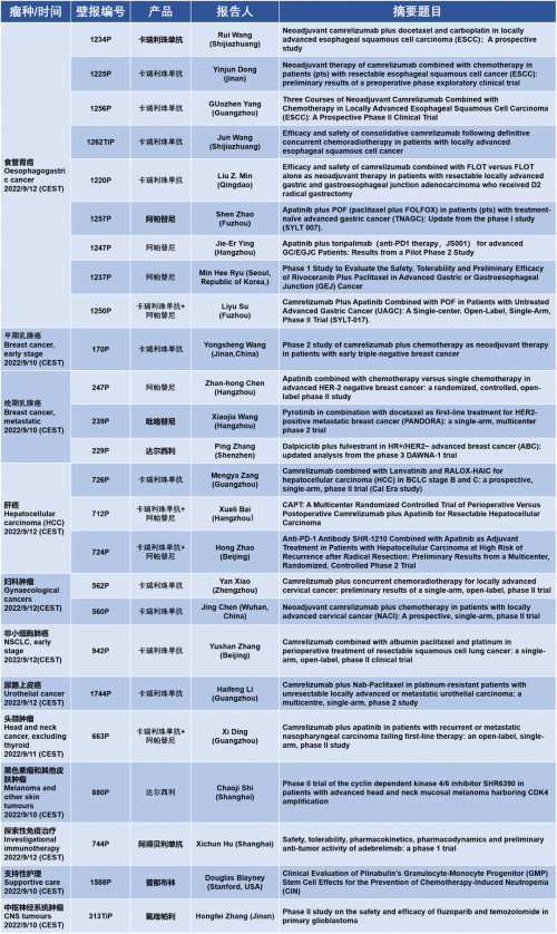 作为从事创新和高品质药物研发的国际化制药企业,PA电子医药的研究成果在2022 ESMO大会上还收获了25项壁报形式的报告。其中,食管胃癌领域共有9项研究入选,研究的方案主要是卡瑞利珠单抗或卡瑞利珠单抗联合阿帕替尼,通过与化疗或放化疗联用,新辅助治疗食管鳞癌或胃癌。2022年9月12日(CEST),让我们齐聚ESMO大会,共同领略食管胃癌研究领域的学术盛宴。此外,PA电子医药达尔西利、吡咯替尼、阿得贝利单抗等创新药还有4项乳腺癌研究、3项肝癌研究及其他领域的9项研究都将会以壁报展出,让我们共同期待!