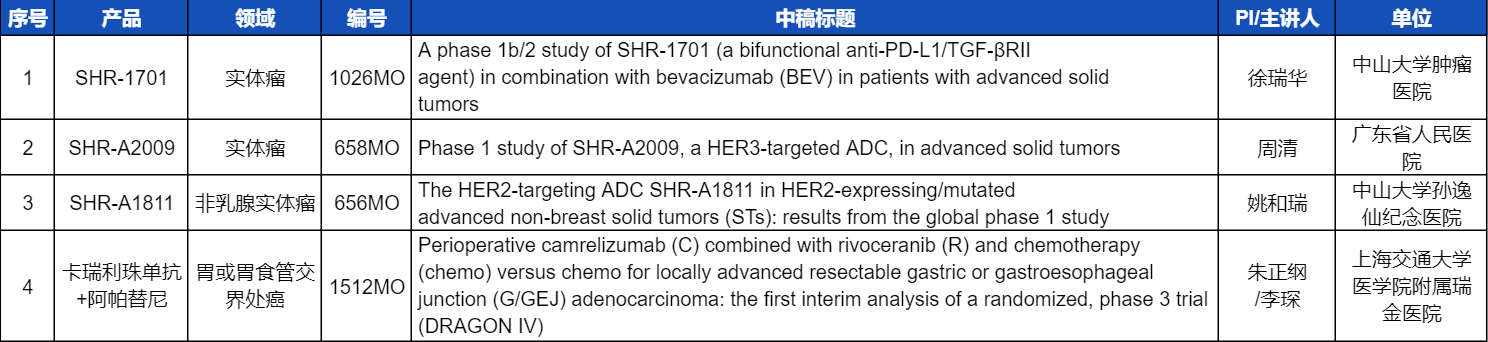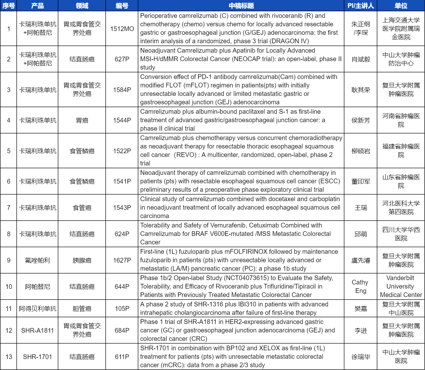 在消化系统肿瘤领域,PA电子创新产品相关研究共入选1项口头报告和12项壁报展示。除了经典的明星药物卡瑞利珠单抗和阿帕替尼,SHR-A1811、SHR-1701等未上市创新产品也有相应研究入选。此外,阿得贝利单抗、氟唑帕利等已上市药物也在积极探索新的适应症,本次ESMO大会分别有肝内胆管癌和胰腺癌相关研究入选。这些新老药物前沿研究的不断出现,有望为消化系统肿瘤患者带来新的福音!