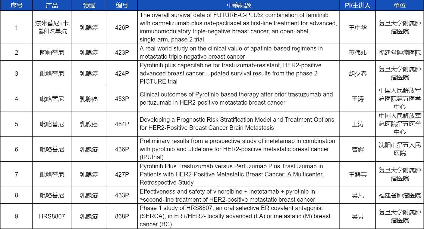 12款抗肿瘤创新药包括6款已上市产品:注射用卡瑞利珠单抗(艾瑞卡®)、甲磺酸阿帕替尼片(艾坦®)、马来酸吡咯替尼片(艾瑞妮®)、阿得贝利单抗注射液(艾瑞利®)、氟唑帕利胶囊(艾瑞颐®)、瑞维鲁胺片(艾瑞恩®),以及6款未上市产品:多靶点受体酪氨酸激酶抑制剂法米替尼、抗PD-L1/TGF-βRII双抗SHR-1701、组蛋白甲基转移酶EZH2抑制剂SHR2554、HER2抗体偶联药物(ADC)SHR-A1811、HER3抗体偶联药物SHR-A2009、新型选择性雌激素受体共价拮抗剂(SERCA)HRS8807等。此次ESMO大会的最新突破摘要(LBA)结果尚未披露,敬请期待!本文特对33项研究成果做了梳理,带领各位读者领略PA电子医药创新之光。