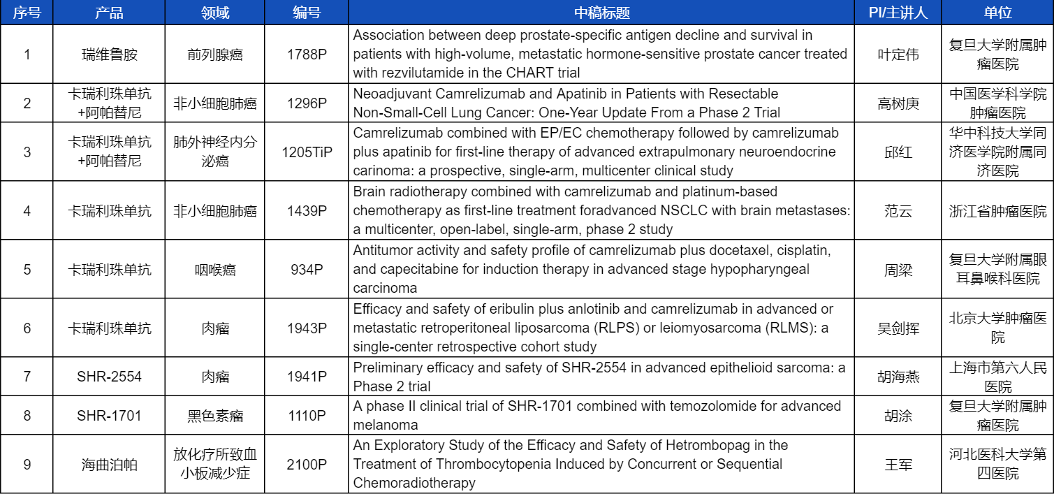 在非小细胞肺癌、咽喉癌、肉瘤、前列腺癌、黑色素瘤等多个领域,卡瑞利珠单抗、阿帕替尼、瑞维鲁胺、SHR-1701、SHR2554等创新产品相关研究一共入选了8项壁报展示。此外,PA电子医药自主研发的血小板生成素受体激动剂(TPO-RA)海曲泊帕在放化疗所致血小板减少领域的探索性研究显示良好的疗效,入选壁报展示。