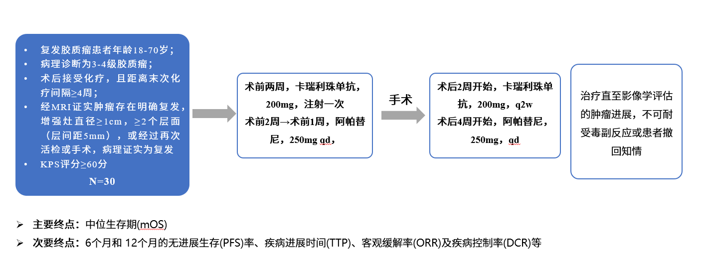 本研究是一项单中心、单臂、前瞻性临床研究(NCT04588987)。主要入选标准有:复发胶质瘤患者年龄18-70岁;病理诊断为3-4级胶质瘤;KPS评分≥60分。排除标准有:之前接受过免疫治疗及抗肿瘤血管生成药物治疗。本研究中,患者接受卡瑞利珠单抗,200mg/次,术前2周注射一次,同时术前2周开始口服阿帕替尼250mg/d,连续服用至术前7天停药。术后2周开始每2周1次卡瑞利珠单抗剂量用法同上,术后4周每日口服阿帕替尼剂量用法同上,直至影像学发现肿瘤进展,或患者不可耐受毒副反应。主要终点为中位生存期(mOS)。关键次要终点包括6个月和 12个月的无进展生存(PFS)率、疾病进展时间(TTP)、客观缓解率及疾病控制率等。