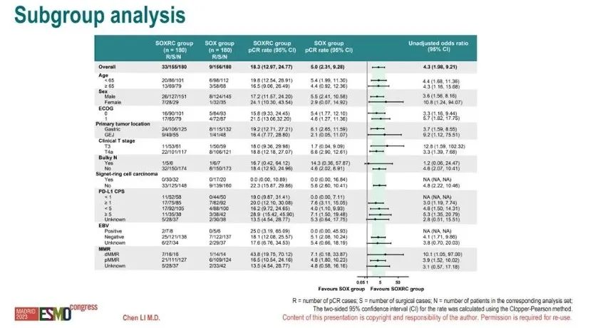 • 行手术治疗的人群中,SOXRC组和SOX组pCR率分别为21.3%和5.8%,R0切除率分别为98.7%和94.2%。