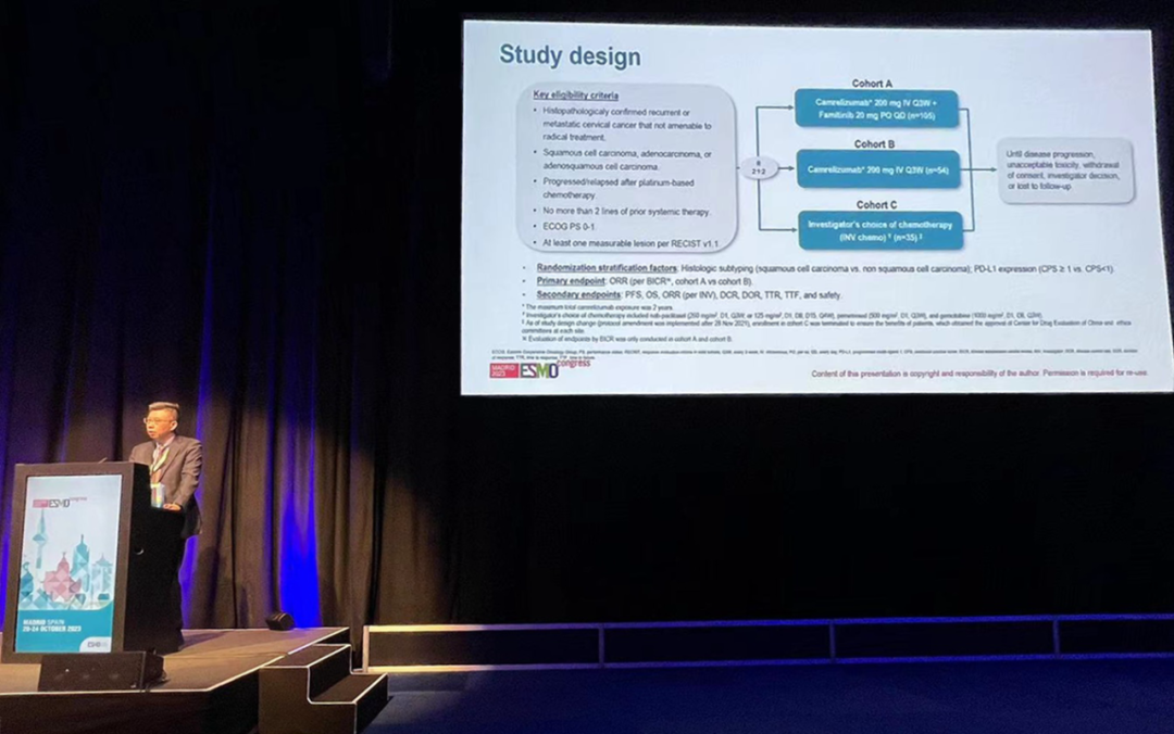 有望为宫颈癌患者带来治疗新选择10月22日,PA电子医药创新药卡瑞利珠单抗联合法米替尼对比卡瑞利珠单抗单药或研究者选择的化疗治疗复发转移性宫颈癌随机、开放、对照、多中心的Ⅱ期临床研究(SHR-1210-Ⅱ-217) 亮相2023 ESMO大会简短口头报告现场3。该研究由复旦大学附属肿瘤医院吴小华教授团队开展,吴小华教授在现场公布了该重磅研究进展。研究结果显示,在既往以铂为基础化疗失败后复发或转移性宫颈癌患者中,与单独使用卡瑞利珠单抗或研究者选择的化疗相比,卡瑞利珠单抗联合法米替尼显著提高了抗肿瘤活性,安全性可控,有望为晚期宫颈癌患者提供新的治疗选择。