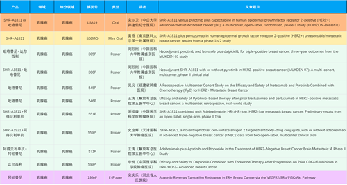 在乳腺癌领域,PA电子创新产品相关研究共入选1项口头报告、1项简短口头报告、8项壁报和1项电子壁报,共11项研究。吡咯替尼、达尔西利、阿得贝利单抗、瑞康曲妥珠单抗等新老创新药物,均有多篇研究入选,展现出PA电子医药在乳腺癌领域多年深耕的丰硕成果。