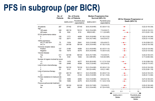 研究达到了主要终点。BICR评估的中位PFS方面,瑞康曲妥珠单抗组达到30.6个月(95%CI:16.8-NR),吡咯替尼联合卡培他滨组为8.3个月(95%CI:6.9-11.0)。HR=0.22(95%CI:0.15-0.34,P<0.0001)。